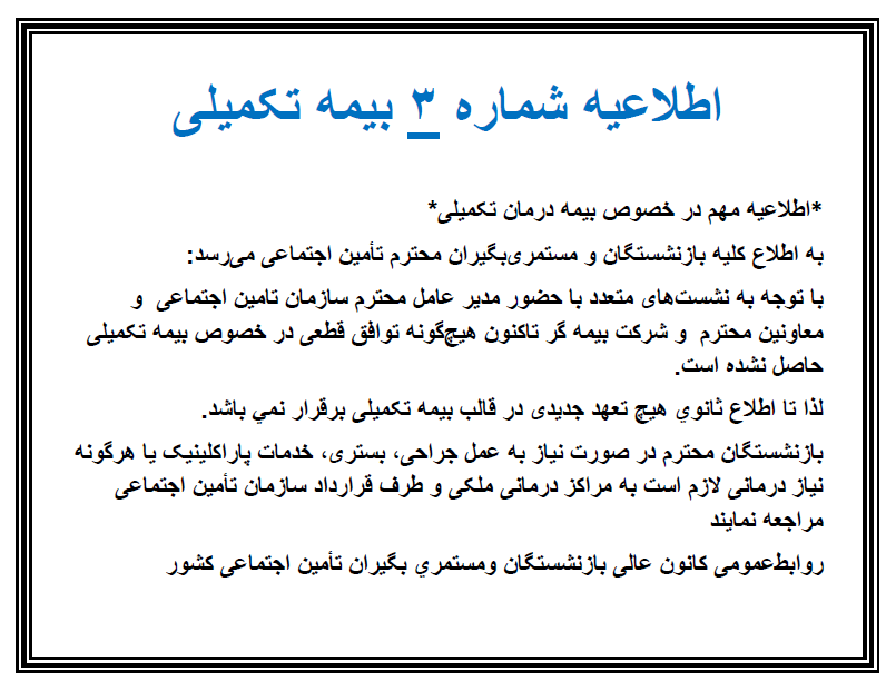 عضو هیات مدیره کانون عالی کارگران بازنشسته تأمین اجتماعی کشور هشدار داد که بیمه تکمیلی بازنشستگان یک حق مسلم و ضرورت حیاتی است و اگر سازمان توان اجرای قانون را ندارد، مسئولان باید کتبا اعلام کنند و مسئولیت آن را بر عهده بگیرند